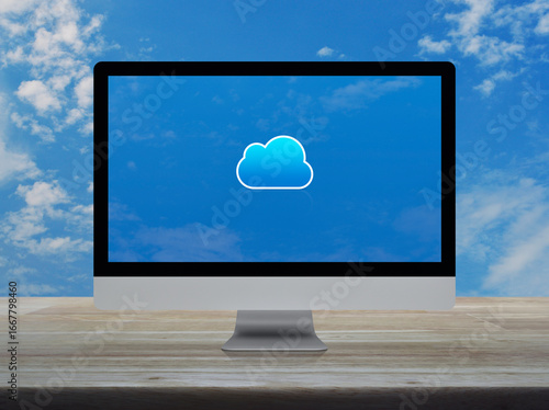 Cloud computing flat icon on modern computer monitor screen on wooden table over blue sky with white clouds, Technology cloud computing concept
