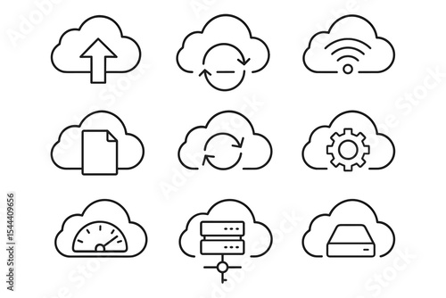 Cloud computing icons: upload, sync, network, document, refresh, settings, speed, data, storage
