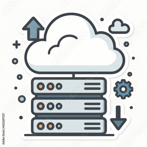Cloud computing infrastructure with data storage servers and upload download functions depicted through modern graphic design elements illustrating digital transformation
