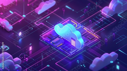 Cloud computing isometric concept with server room and cloud on ultraviolet background.