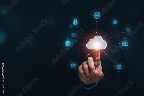 Cloud Computing Network: A hand interacts with a glowing cloud icon, symbolizing a secure and interconnected cloud computing network. The image conveys concepts of data security.