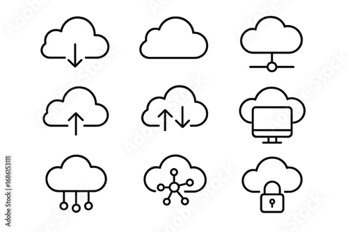 Cloud computing outline icon set. Virtual network, tech symbols in line art style. Vector collection for data storage, server, database, upload, download, and security concepts.