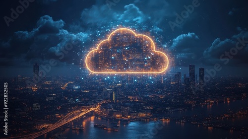 Cloud Computing Over Cityscape at Night.