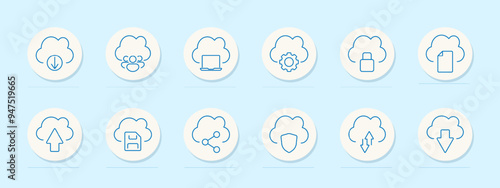Cloud computing set icon. Upload, download, sharing, laptop, settings, security, folder, synchronization, network, cloud storage, data, backup, online, access, server, technology, internet