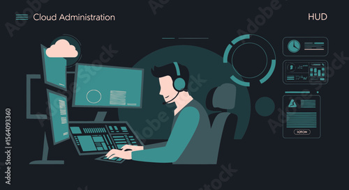 Cloud Computing System Administrator Overseeing Complex Network On Multiple Displays