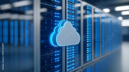 Cloud computing technology concept with a glowing cloud icon over data server racks in a modern data center.