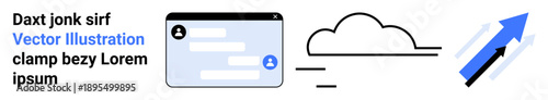 Cloud computing, technology growth, data transfer, user profiles, process optimization, analytics. Cloud icon with arrows and user profile window. Cloud computing and technology growth concept