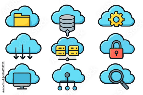 Cloud computing technology icon set. Vector flat cartoon icons for data storage, server hosting, database, security, network, download, settings, search and management concepts.