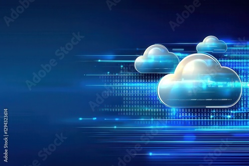 Cloud computing technology with data network. Digital clouds with data streams in a blue background, representing cloud computing and technology.