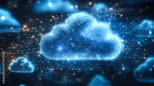 Cloud computing. The data transfer and storage concept has a cloud in the middle connected to a white polygon inside