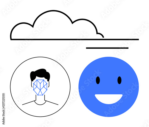 Cloud connected to face recognition pattern and a happy face illustrating data processing, AI, and emotion tracking. Ideal for AI, data security, analytics, machine learning, digital identity