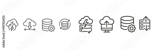 Cloud data management icons illustrating various processes for efficient file transfer and storage