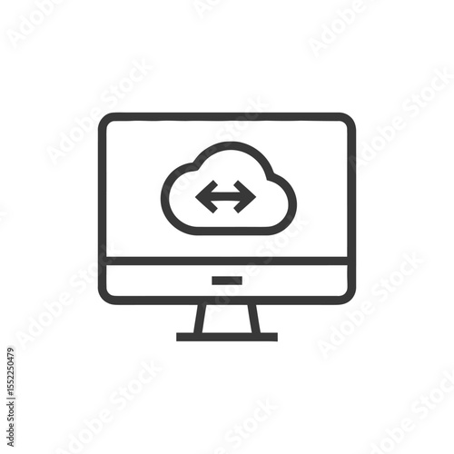 Cloud Data Transfer on Computer Screen, Minimalist Line Art Icon