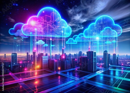 Cloud Database Technology Concept with Neon Structures in Panoramic View