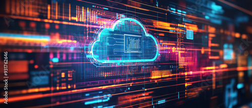 Cloud file integration, A vibrant holographic display showcasing seamless file integration through a cloud network, featuring interactive data streams and tech graphics, set