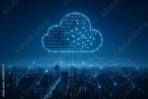 Cloud icon made of binary code and network lines hovering above a connected cityscape, symbolizing cloud computing network, urban data sharing, and smart digital infrastructure