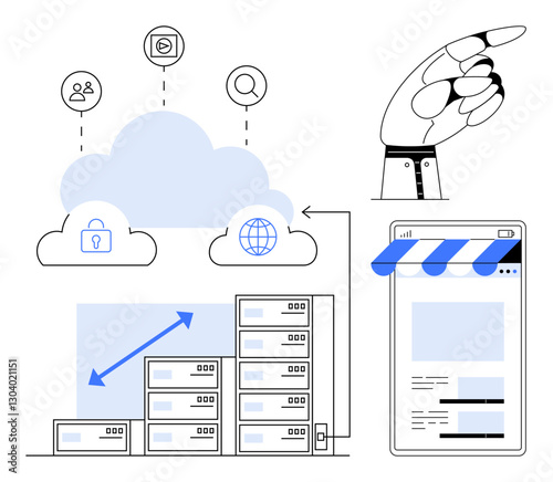 Cloud icons linked to web search, profiles, secured data, scalable servers, robotic hand, and e-commerce page. Ideal for technology, scalability, e-commerce security cloud computing networking