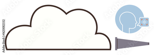 Cloud outline, voice profile with soundwave recognition, and megaphone emphasize communication, data storage, and technology. Ideal for AI, networking, speech analysis, innovation sound processing
