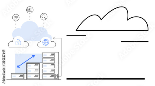 Cloud over server stacks with arrows showing scalability. Icons representing users, security, and global connectivity. Ideal for data storage, scalability, cloud technology, security, networking