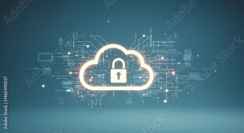 Cloud security concept with digital lock and circuit connections on blue background