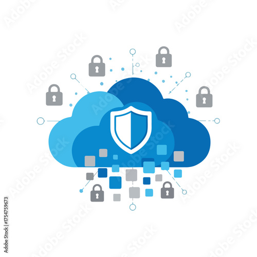 Cloud security network with shield and padlock icons