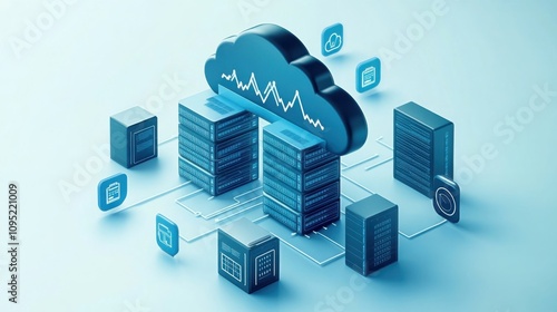 Cloud service storage concept.A digital illustration of cloud computing, featuring servers interconnected with data streams and various icons representing data management and technology.