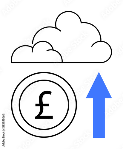 Cloud shape above a pound coin and upward arrow symbolizing cloud computing, economic growth, digital finance. Ideal for finance, investment, technology, data storage, growth success innovation. A
