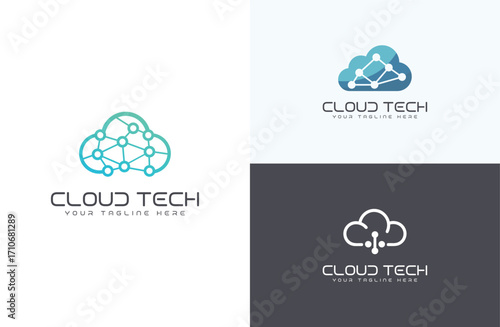 Cloud Tech Logo Concepts with Networked Cloud Shapes and Blue Green Tones Keywords: cloud, technology, tech, network, data, storage, internet