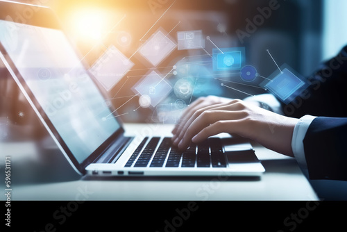 Cloud technology. Data storage and backup. Networking and internet service concept. Man using laptop computer and mobile phone with cloud computing diagram.
