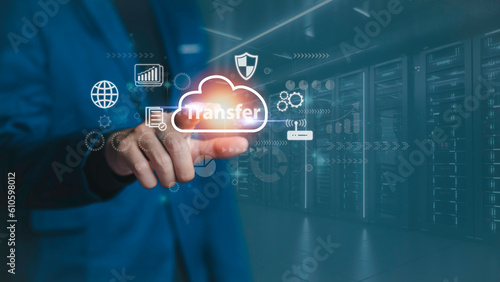 cloud technology data storage and transfer, a global network infrastructure for online access to databases and files in upload and download. With secure software backup data.