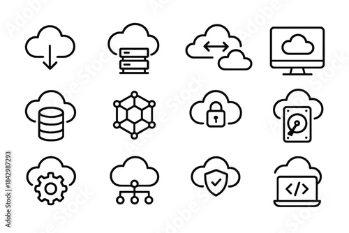 Cloud technology linear icon set. featuring download, server, synchronization, computing, database, security, and network symbols