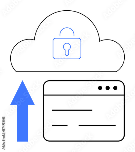 Cloud with padlock illustrates security. Upload arrow and browser represent data transferring safely. Ideal for data storage, backup, encryption, safety, security, technology cloud computing. Flat