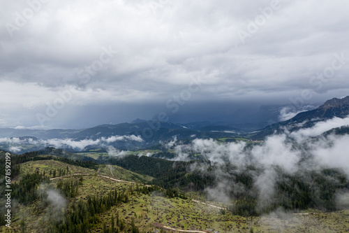 Clouds surround rocky peaks of the Dolomites mountains in Italy on a moody day.
