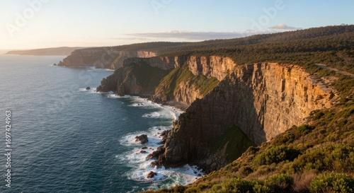 Coastal cliffs and ocean meet; sunset paints the rocks