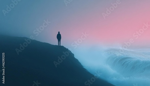 Coastal Sunrise Landscape with Person Standing on Cliff in Iceland