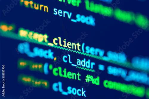 Code of programming language on the screen of laptop. Software development. Programmer coding web application client server. Developer of program code. Coding