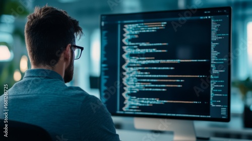Coder at Work Man with Glasses Views Lines of Code on Screen,Programming , Development