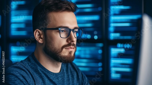 Coder designing database, digital displays, advanced tech environment, glowing blue