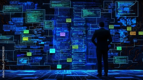 Coding and Development: A programmer immersed in code, surrounded by sticky notes and diagrams.