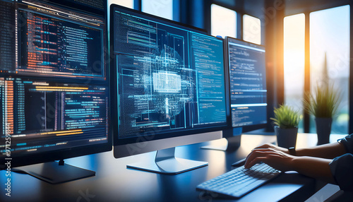 Coding and programming practices, featuring elements like computer screens with code, programming languages, and coding symbols, symbolizing software development