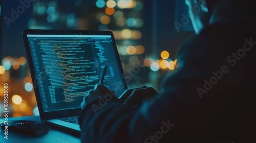 Coding at night software development urban setting digital workspace modern environment close-up view technology focus