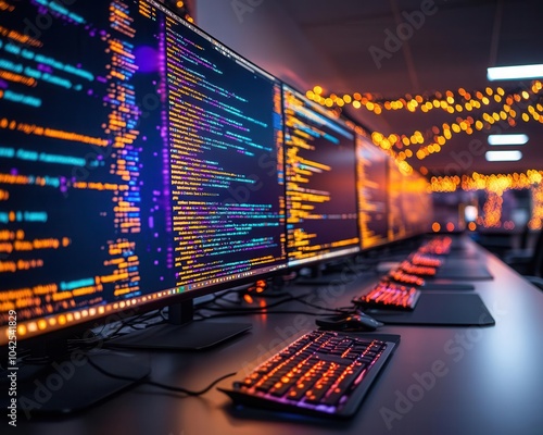 Coding bootcamp, vibrant colors, digital screens, collaborative setting, modern