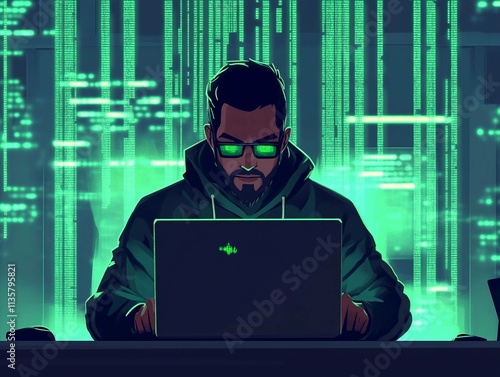 Coding enthusiast works late at night with green code on laptop screen. Generative AI