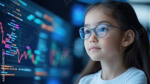 Coding Prodigy: A young girl wearing glasses, gazes intently at a complex data visualization on a computer screen, exploring her potential and future
