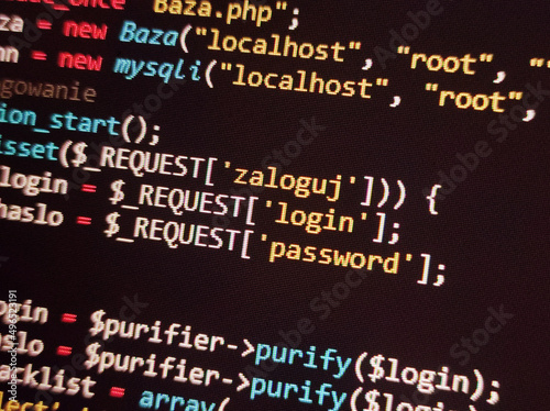 Coding programming source code screen. Abstract technology background. Cyber attack or security concept. Hacker monitor program. Software development