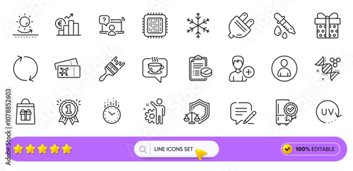 Coffee, Cpu processor and Brush line icons for web app. Pack of Online question, Chemistry dna, Sun protection pictogram icons. Write, Holidays shopping, Chemistry pipette signs. Search bar. Vector