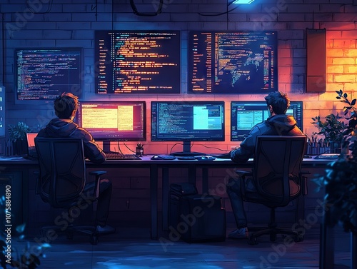 Collaborative coding session tech office digital workspace modern environment overhead viewpoint innovation in programming