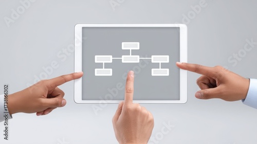 Collaborative interaction with a tablet displaying a flowchart, highlighting teamwork and technology.