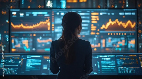 Collaborative team analyzing realtime insights a glowing large screen displaying dynamic charts market trends and visual analytics