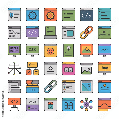 Collection of Colorful Web Development and Programming Icons Featuring Browser Windows Code Links and Network Diagrams Depicting Various Aspects of Software Development and Website Design in